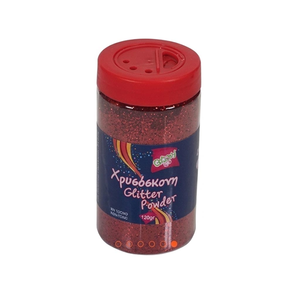 Κόκκινη χρυσόσκονη 120gr σε πρακτικό δοχείο, ιδανική για εικαστικά, σχολικές εργασίες και γιορτινή διακόσμηση.