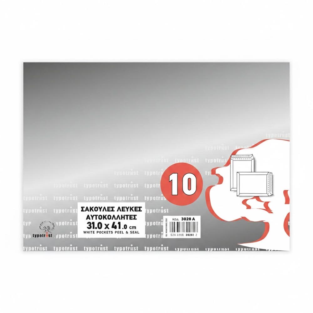 Σετ 10 καφέ (Kraft) αυτοκόλλητων σακουλών Typotrust, διαστάσεων 31×41 εκ. Ενισχυμένη κατασκευή σε πρακτική συσκευασία συρρίκνωσης, ιδανική για την ασφαλή αποστολή μεγάλων εγγράφων, την οργάνωση λαχειοφόρων και την προστασία επαγγελματικών καρτών.