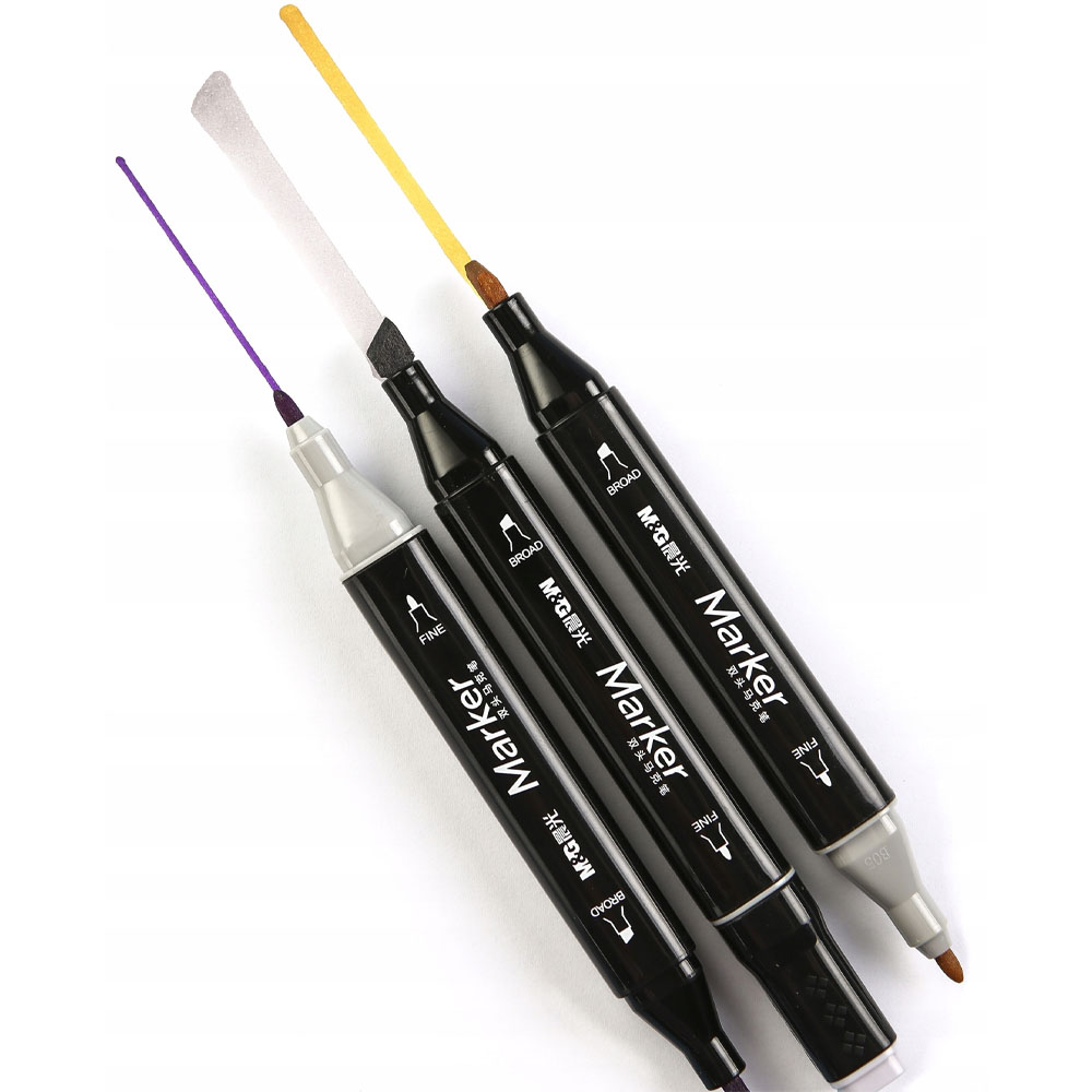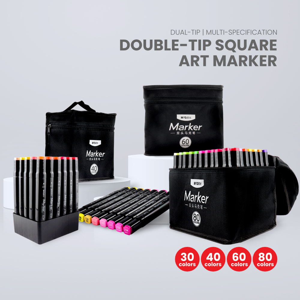 Ανακαλύψτε τους τετράγωνους μαρκαδόρους τέχνης M&G Pro με διπλή άκρη, διαθέσιμους σε συσκευασίες των 30, 40, 60 ή 80 χρωμάτων, όλοι τακτοποιημένοι σε μια υφασμάτινη σακούλα για την ευκολία σας.