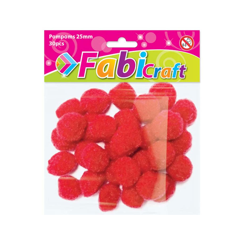 Σετ 30 τεμαχίων μαλακά πον πον σε έντονο κόκκινο χρώμα, διαμέτρου 2.5 εκ. (25mm) από τη Fabi. Ιδανικά για διακόσμηση, κατασκευές, σχολικά projects και δημιουργικές δραστηριότητες για παιδιά και ενήλικες.