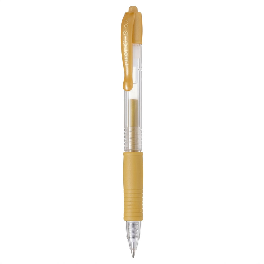 Στυλό Gel Rollerball Pilot G-2 0.7 σε μεταλλικό χρυσό χρώμα (Metallic Gold). Με εργονομική μαλακή λαβή για ξεκούραστη γραφή και μελάνι gel υψηλής ποιότητας για απαλή ροή και λαμπερό αποτέλεσμα.