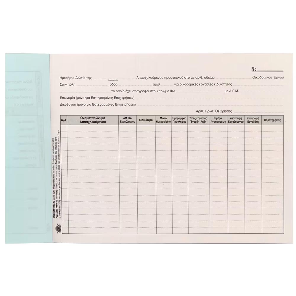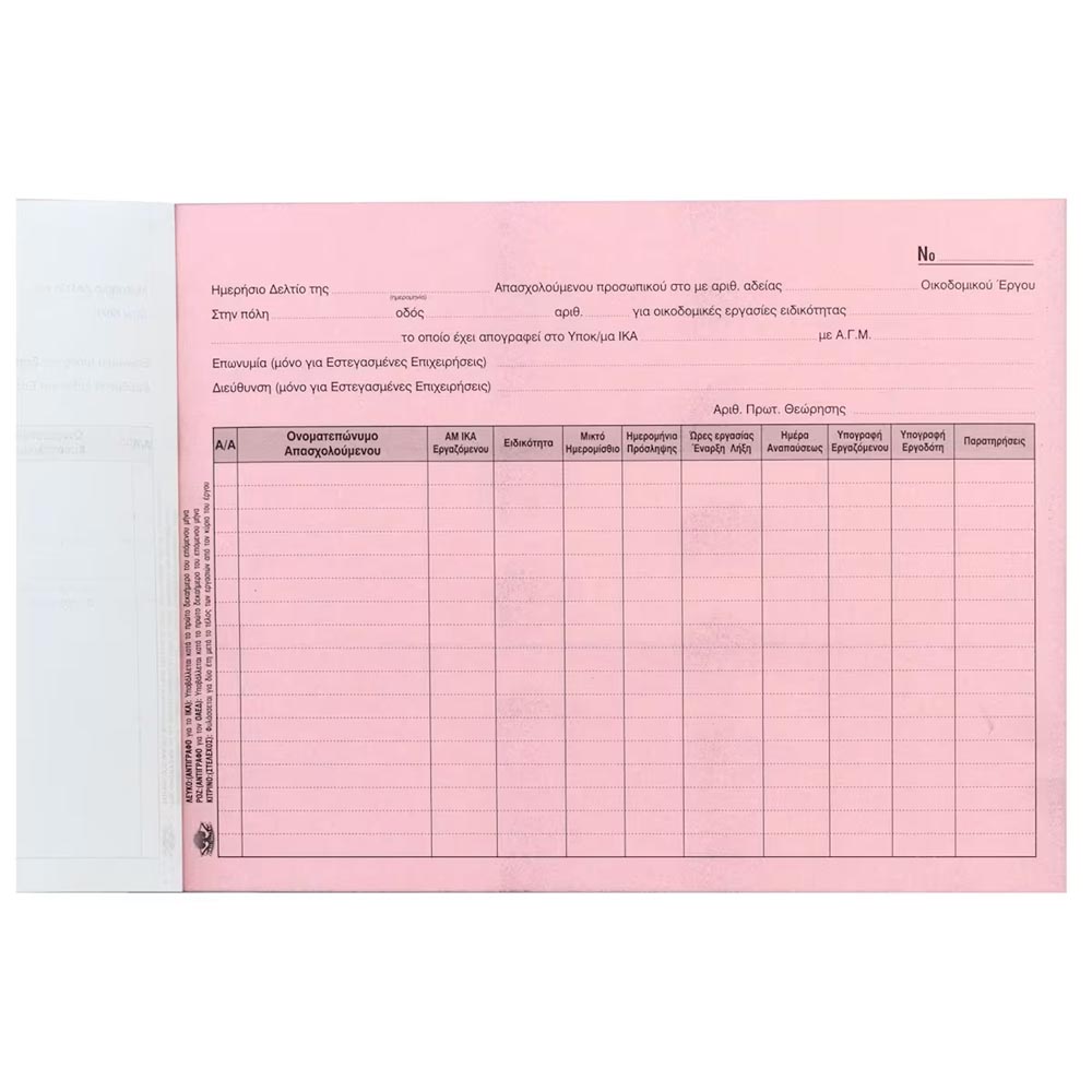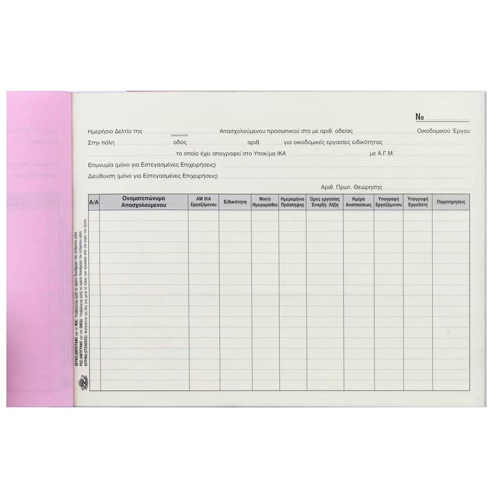 Λειτουργικότητα & Ποιότητα: Το βιβλίο περιλαμβάνει 31 σετ αυτογραφικών φύλλων, σε τριπλότυπη μορφή (31×3). Αυτό επιτρέπει την άμεση δημιουργία αντιγράφων για τον εργοδότη, τον εργαζόμενο και τις ελεγκτικές αρχές χωρίς τη χρήση καρμπόν. Η στιβαρή του βιβλιοδεσία εγγυάται αντοχή στη σκληρή χρήση που απαιτούν οι συνθήκες του εργοταξίου.